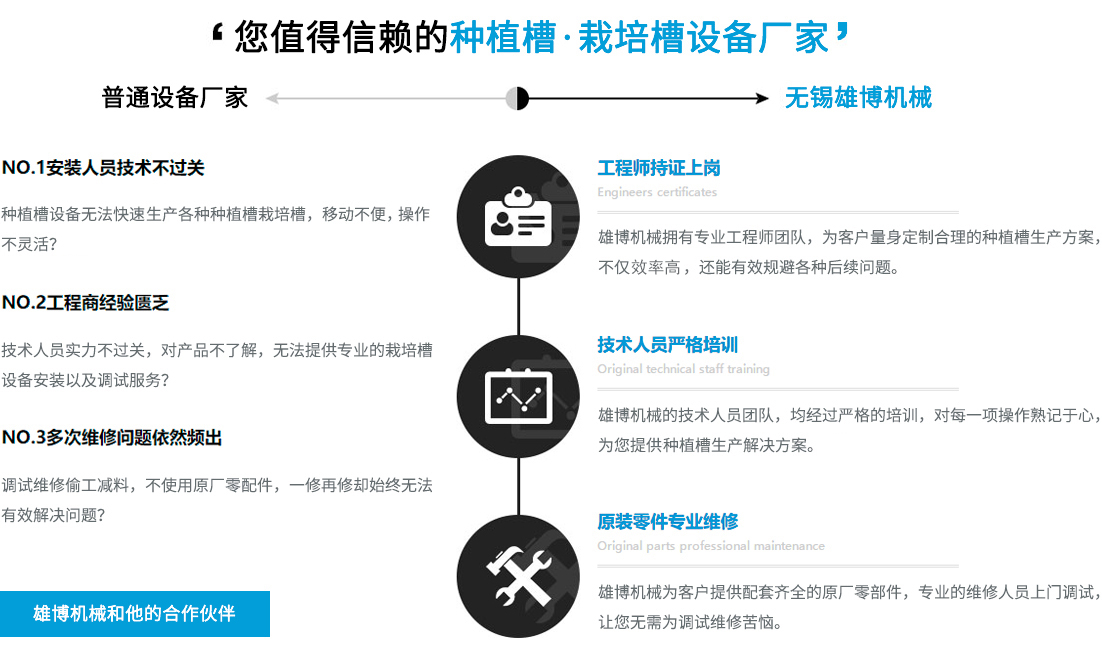 您在選擇雄博產(chǎn)品的同時,也選擇無微不至的終身服務(wù)??筛鶕?jù)不同客戶實際需求進行種植槽設(shè)備,栽培槽設(shè)備等的特殊工藝設(shè)計制造專業(yè)一對一售前/售后/技術(shù)咨詢指導(dǎo),享受更貼心/放心的設(shè)備使用體驗。